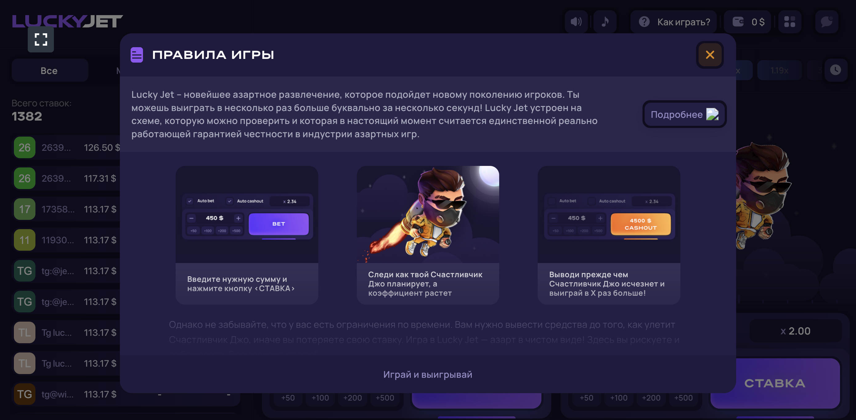 Барлығы қарапайым: сізге бәс тігу керек (бір раунд ішінде бірден 1 немесе 2) және ұшағы бар кішкентай адам ойын алаңынан шыққанға дейін ақшаны алу керек. Уақытыңыз болмаса, ұтыс тігу сомасы казиноға түседі. Қайтару мүмкіндігінсіз. Сондықтан сізге Lucky Jet құмар ойындарына байыпты қарауды ұсынамыз. Ойынның басты кейіпкері ойын алаңында болғанда, әртүрлі тактикаларды қолданыңыз, қосалқы функцияларды іске қосыңыз және ақшаны алыңыз.