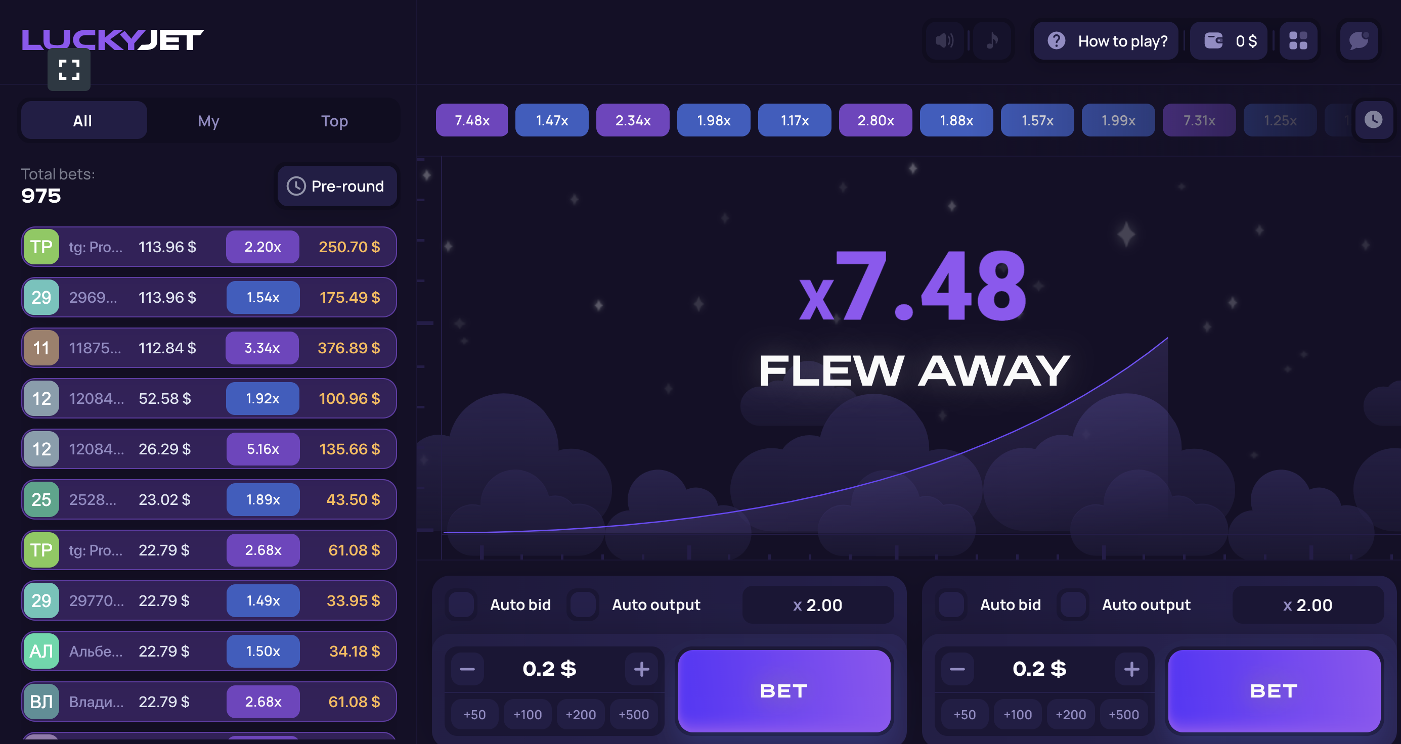 Тексеру процесінен өтуді ұсынамыз. Өйткені, қаражатты алу расталмаған шот иелерімен шектеледі. Бірақ бұл соншалықты маңызды емес, өйткені Pin Up ойынында көптеген адамдар жақсы көретін Lucky Jet ойыны бар! Оның казинода ұсынылған нұсқасы кәдімгі стандарттан еш айырмашылығы жоқ. Қажетті функциялар, ақпараттық өрістер, минималистік дизайн – мұның бәрі ойыншыларға казино ұсынатын Lucky Jet нұсқасын сипаттайды.